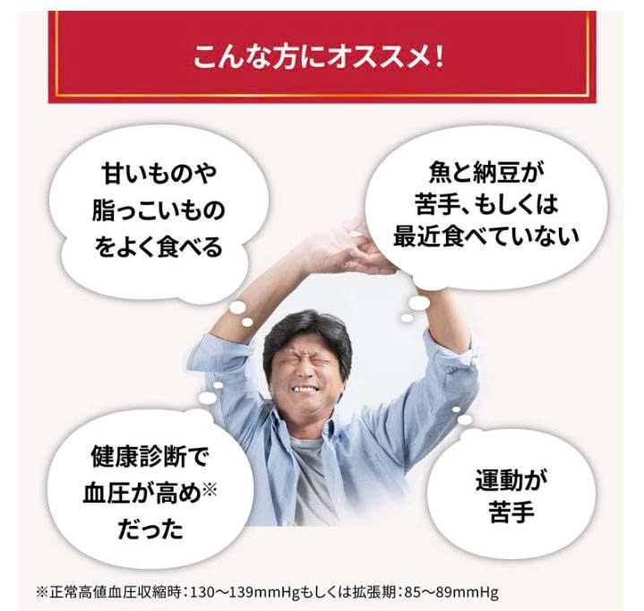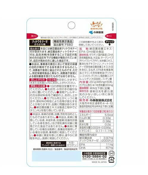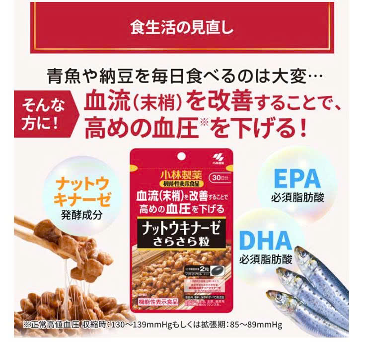 ・Thông báo: Sản phẩm này chứa nattokinase chiết xuất từ vi khuẩn natto. Nattokinase chiết xuất từ vi khuẩn natto đã được chứng minh là có tác dụng hạ huyết áp ở người cao huyết áp bằng cách cải thiện lưu lượng máu ngoại vi. Sản phẩm này phù hợp cho người cao huyết áp.